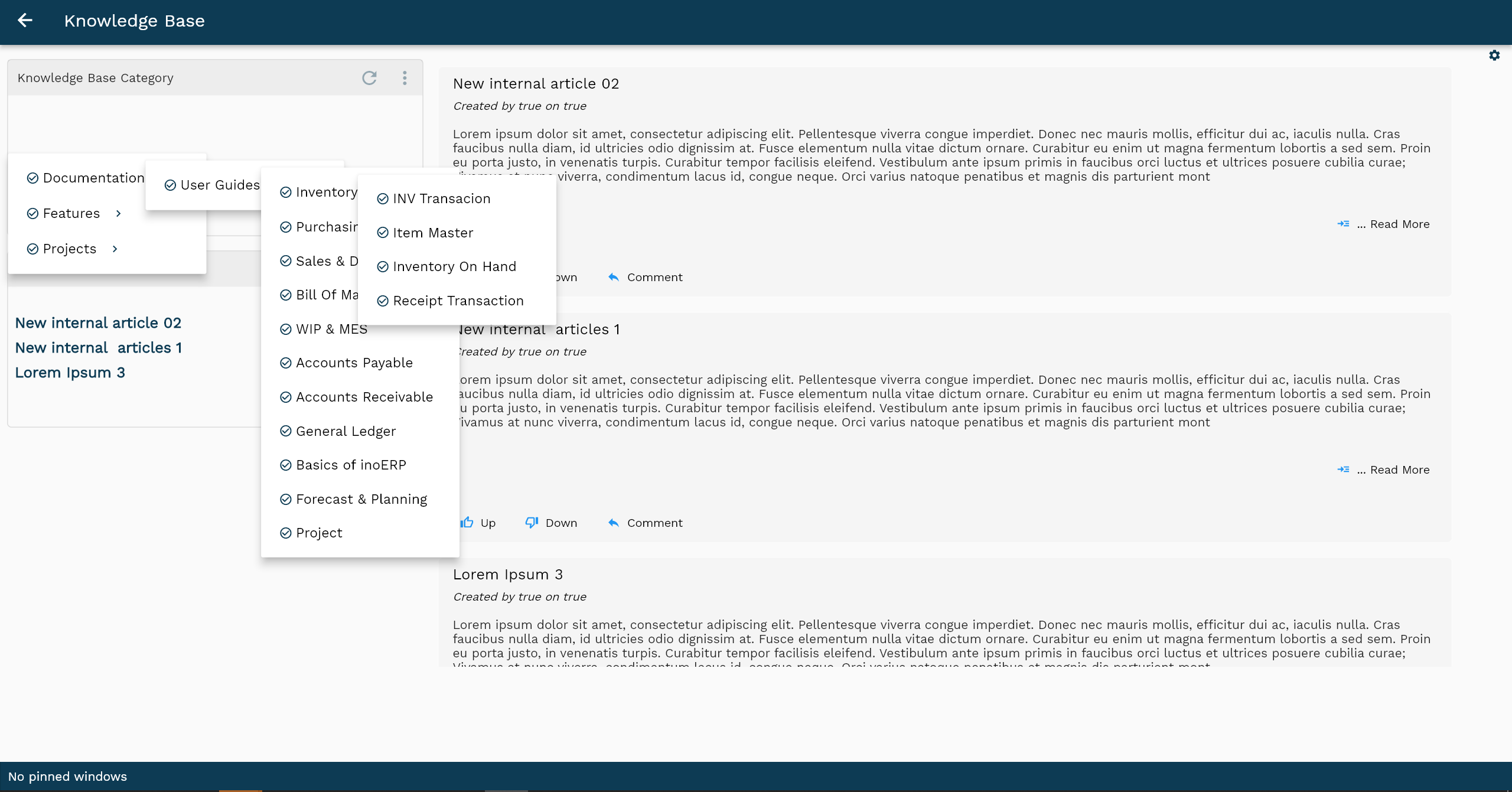 Shows navigation panel to select a specific knowledge base category. Click on any category to view all the knowledge bases associated with the category. All the knowledge bases are shown in the right panel (section 3) -